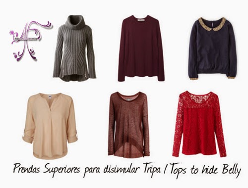For our Tops we will take those that outline the body without tight it, but not too wide as it would add an excessive volume. Opt for straight and shaped "A" cuts. The draping effect and frills or small flights in the center of the body also will help us a lot. We can also play with necklines and accessories, so that attention is diverted to the upper body.