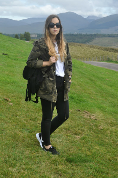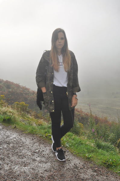 Para ese día elegí un outfit super cómodo compuesto por jeans negros, camiseta blanca, chaqueta militar (adoro esta chaqueta) y nikes. Como complementos mi inseparable Daniel Wellington, gafas de sol (que aunque no hacía mucho sol la luz era bastante molesta) y mochila de flecos.