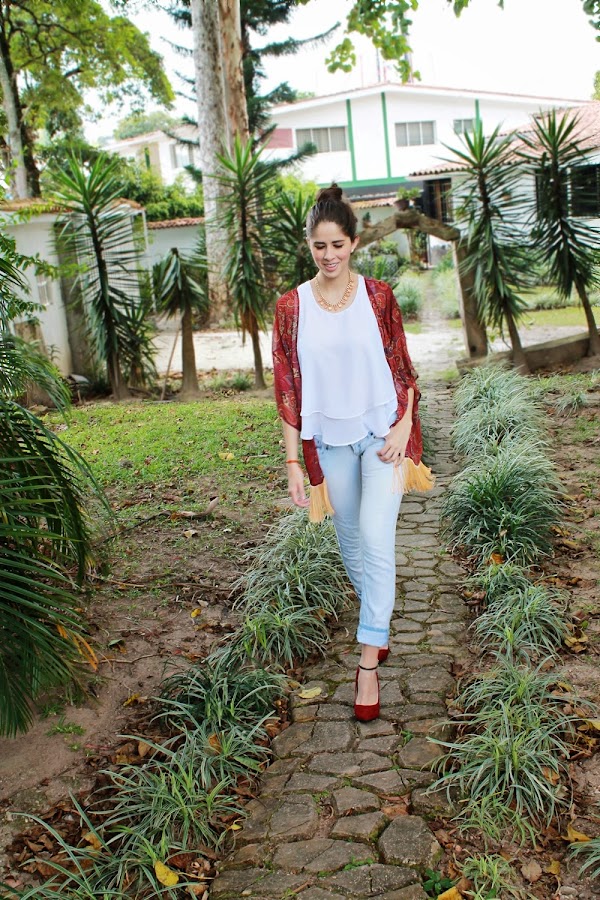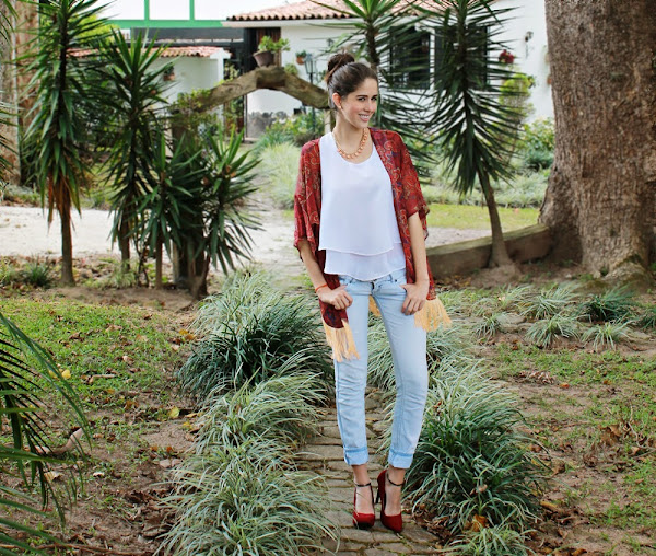 Una camisa blanca de vuelo, unos boyfriends jeans, tacones y por supuesto no nos olvidemos de los hermosos accesorios que son el toque final (el collar lo puedes encontrar en LuJo Accesorios) son las prendas seleccionadas para inspirarlas con un look que podrían usar diariamente ya que es básico y simple pero dándole el toque chic con el kimono.