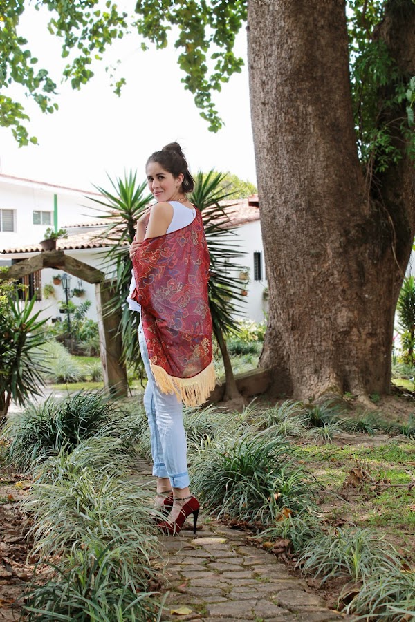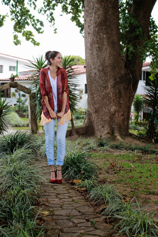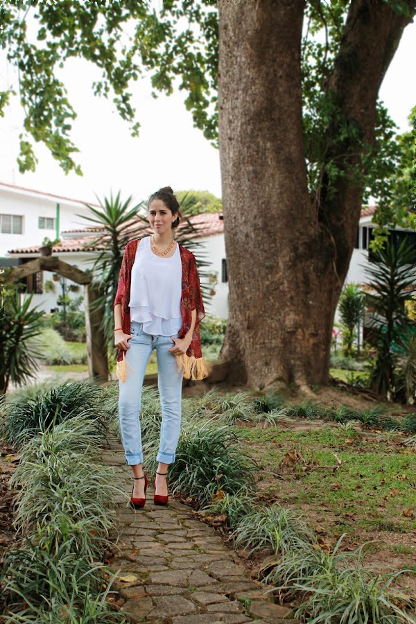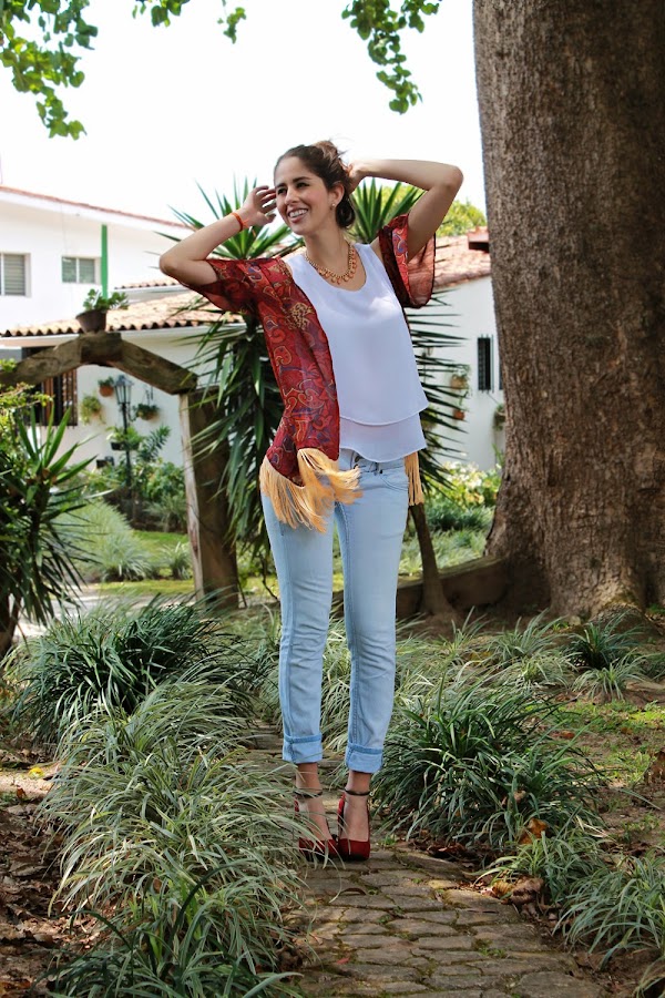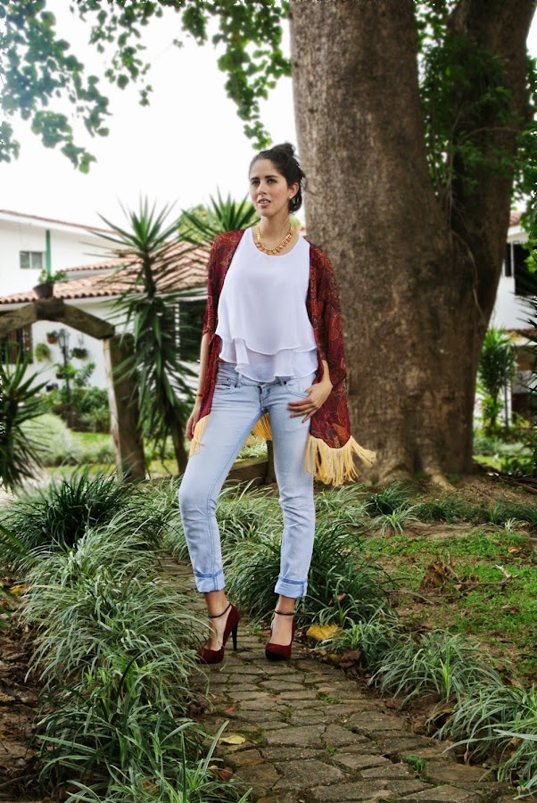 Kimono y Top: Kathamandu / Jean: Bershka / Collar: Lujo Accesorios / Zapatos: Zara