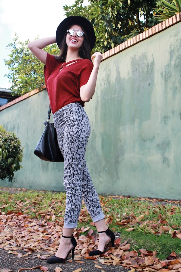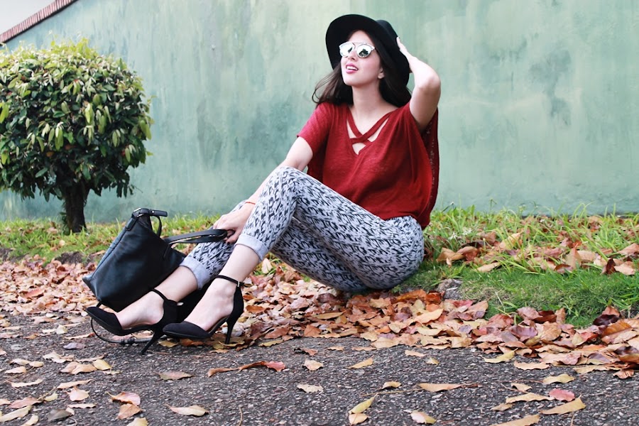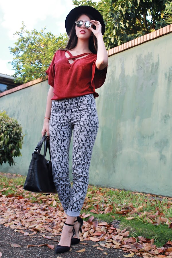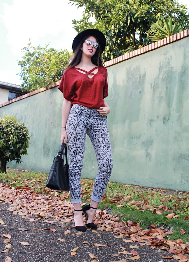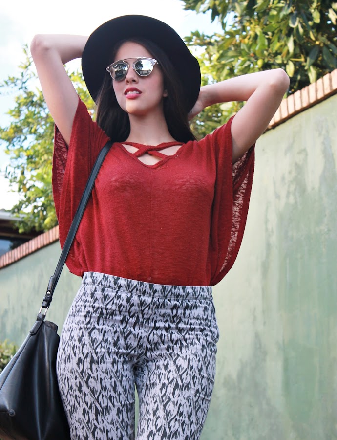 El color burgundy o color vino estará marcando tendencia en esta temporada como ya lo ha venido haciendo y les aseguro que lo veremos mucho en pasarelas y alfombras rojas, es uno de mis colores favoritas ya que al ser tan blanca realza mi color de piel, cabello y ojos. El escote con tiras en la parte delantera también estará muy de moda, hay personas que las usan pronunciadas yo me decidí por un escote sutil y simple, con pantalones estampados para que le den ese toque diferente a todo el look.