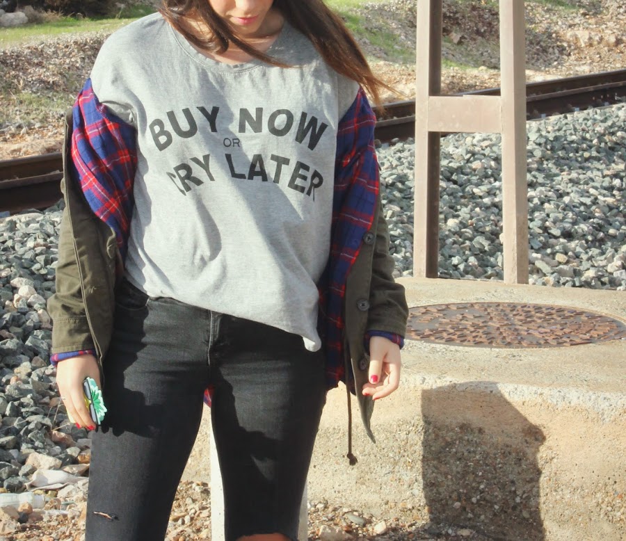 Hello everyone! November finally! Its here my favourite month of the year. Today I show you a casual and very stylish look. Little details give to the outfit a special touch. Im wearing a t-shirt that I loved for its sentence Buy now or cry later but the most I liked it was its price... So cheap!!