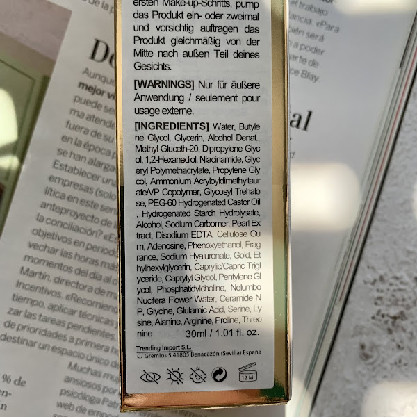 Agua, butilenglicol, glicerina, alcohol desnaturalizado, metil glucet-20, dipropilenglicol, 1,2-hexanodiol, niacinamida, polimetacrilato de glicerilo, propilenglicol, copolímero de acriloildimetiltaurato de amonio / VP, trehalosa de castor hidrogenado, aceite de PEG-60 hidrogenado Hidrolizado de almidón, alcohol, carbómero de sodio, extracto de perla, EDTA disódico, goma de celulosa, adenosina, fenoxietanol, fragancia, hialuronato de sodio, oro, etilhexilglicerina, triglicérido caprílico / caprico, caprilil glicol, pentilen glicol cefalina, fospilamina , Glicina, ácido glutámico, serina, lisina, alanina, arginina, prolina, treonina.