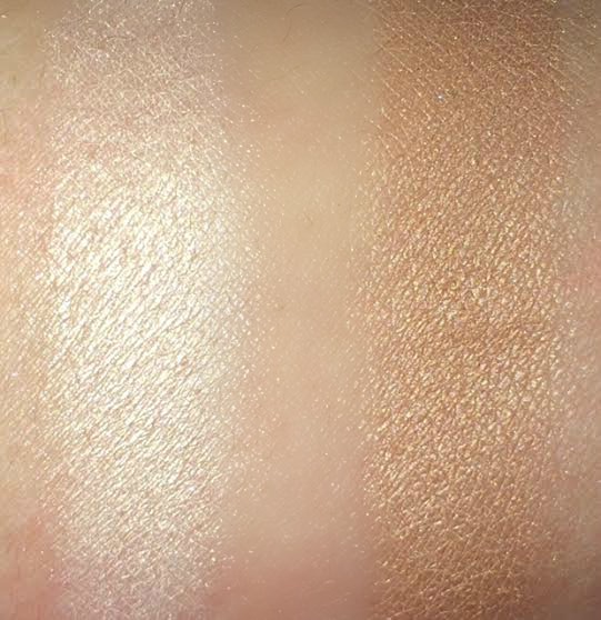 Aunque el producto se describe como un 2 en 1 para esculpir e iluminar yo lo veo más como iluminador porque prefiero que el tono oscuro de mis productos de contorno sea mate. El tono dorado es precioso, deja una luz natural muy bonita, me recuerda un poco al Mary Lou Manizer de The Balm, pero un poco más ligero. Os dejo los swatches de ambos tonos para que los veáis en acción .