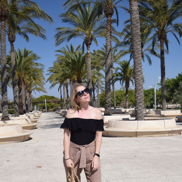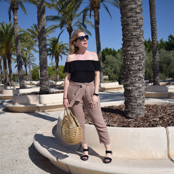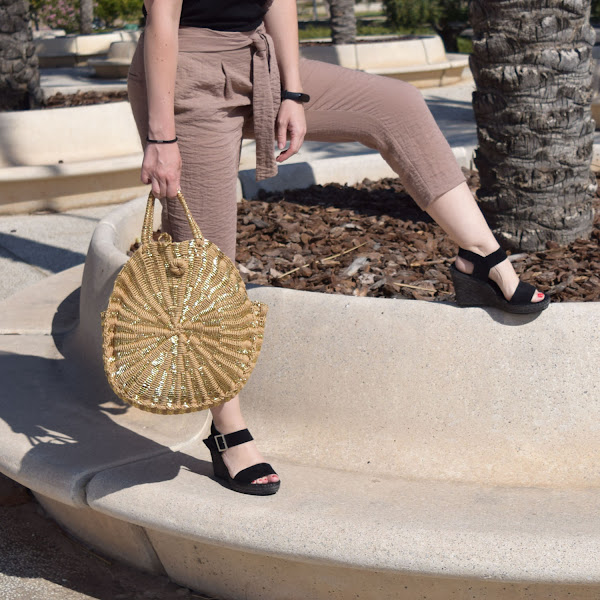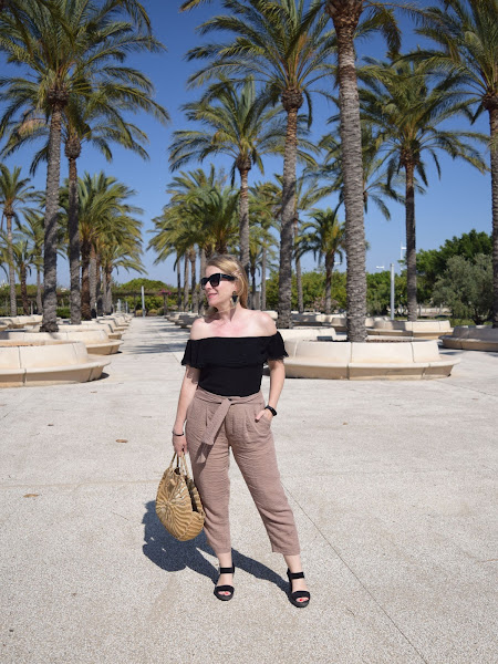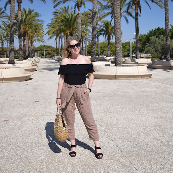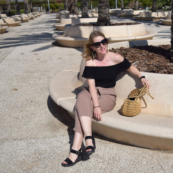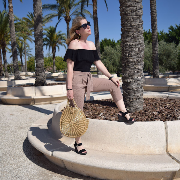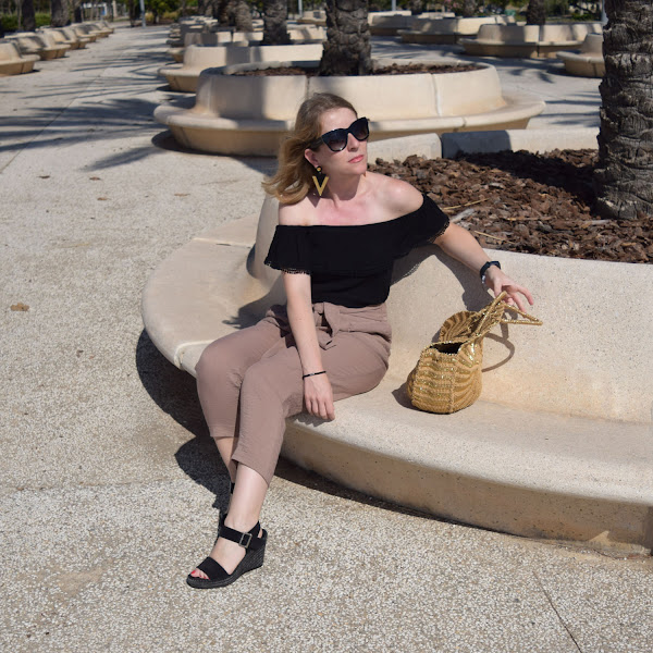 Como hizo bastante viento, que seguro se aprecia en las fotos, opté por un pantalón estilo crop, con cuñas, que a mi es como más me gusta y estiliza, con una camiseta negra estilo bardot o de hombros al aire, que me pongo poco pero me encantan cómo resaltan la parte de los hombros y cuello, creo que mi parte del cuerpo favorita.