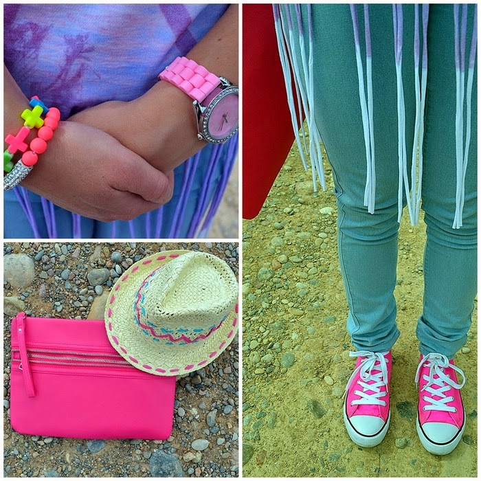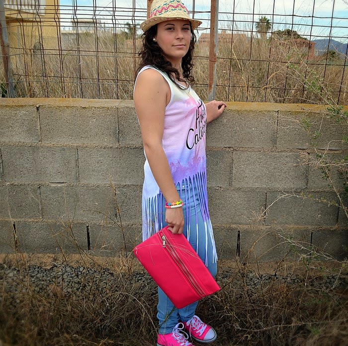 Hola! ¿Que tal ha ido el fin de semana? Ahora ya podemos decir que estamos en junio de verdad, ya se va notando el buen tiempo :) Hoy os propongo un look muy casual y un poco bohemio. Las que me conocen verán que es un poco atípico, pero como a la gran mayoría de la gente, siempre tenemos días en los que no nos apetece arreglarnos y preferimos buscar la comodidad ante todo. Pues este fin de semana yo he tenido uno de esos días. La camiseta de flecos y con mensaje que llevo me encantó nada más verla. A mi mente vinieron imágenes de posibles ocasiones para utilizarla. Una es esta, con jeans y zapatillas, sin duda un look muy cómodo. Otras opciones son: llevarla con shorts (de forma que los flecos son más largos y queda super original ), utilizarla para ir a la playa o ideal para ir a un festival este verano.