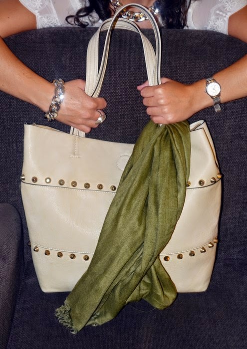 Hoy os muestro un look en el que predomina el color verde caqui.Este color es tendencia esta temporada y vemos como en muchas tiendas los escaparates y algunos rincones están llenos de distintas prendas en tonalidades de caqui. El outfit que os muestro lo llevé hace una semana para ir una tarde de compras por Valencia. Cuando vamos de compras buscamos comodidad ante todo, ya que vamos de un lado para otro y de probador en probador. Opté por unos pantalones caqui con una camiseta de manga corta con detalles de encaje en la parte superior y en las mangas. Elegí un pañuelo del mismo color pero en una tonalidad más clara.