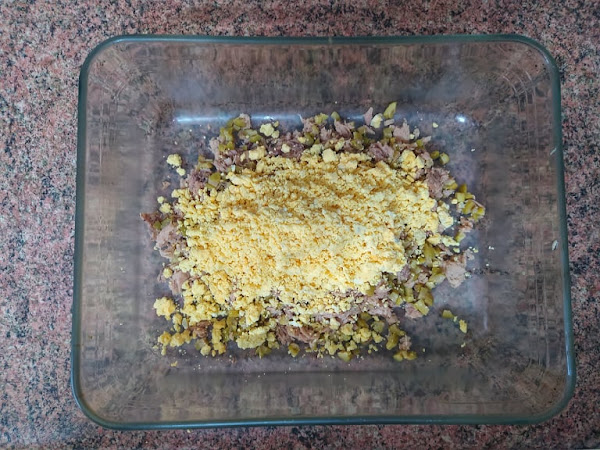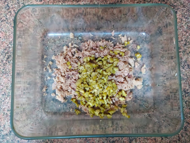 Cortamos en trocitos muy pequeños las aceitunas rellenas de anchoa y las añadimos al atún.