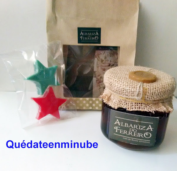 Bote de miel gallega, y unos jabones naturales en forma de estrella.