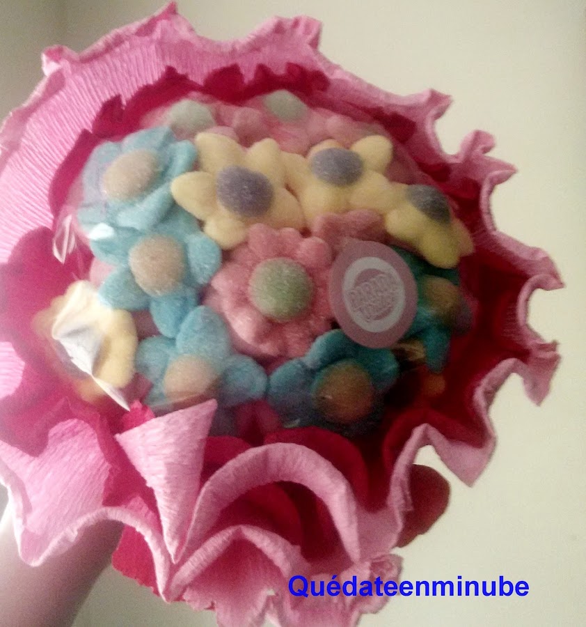 una mezcla que tanto nos gusra, flores y chuches en un sólo regalo, jeje...