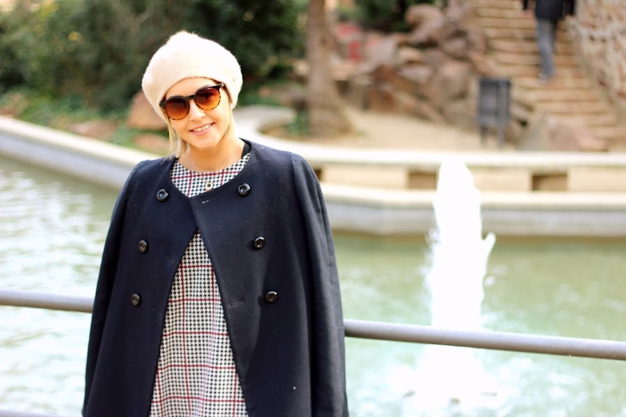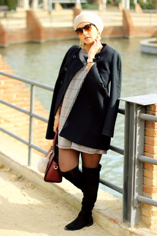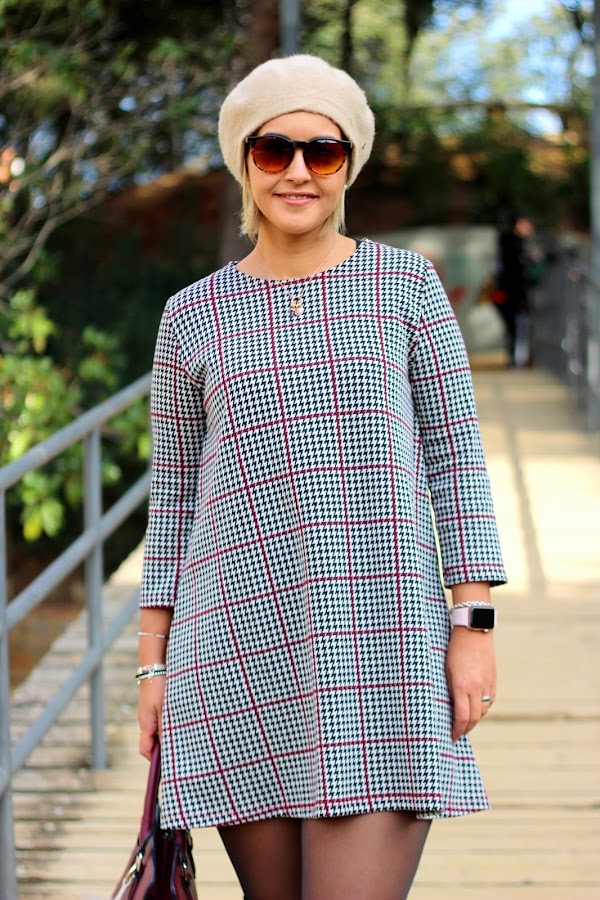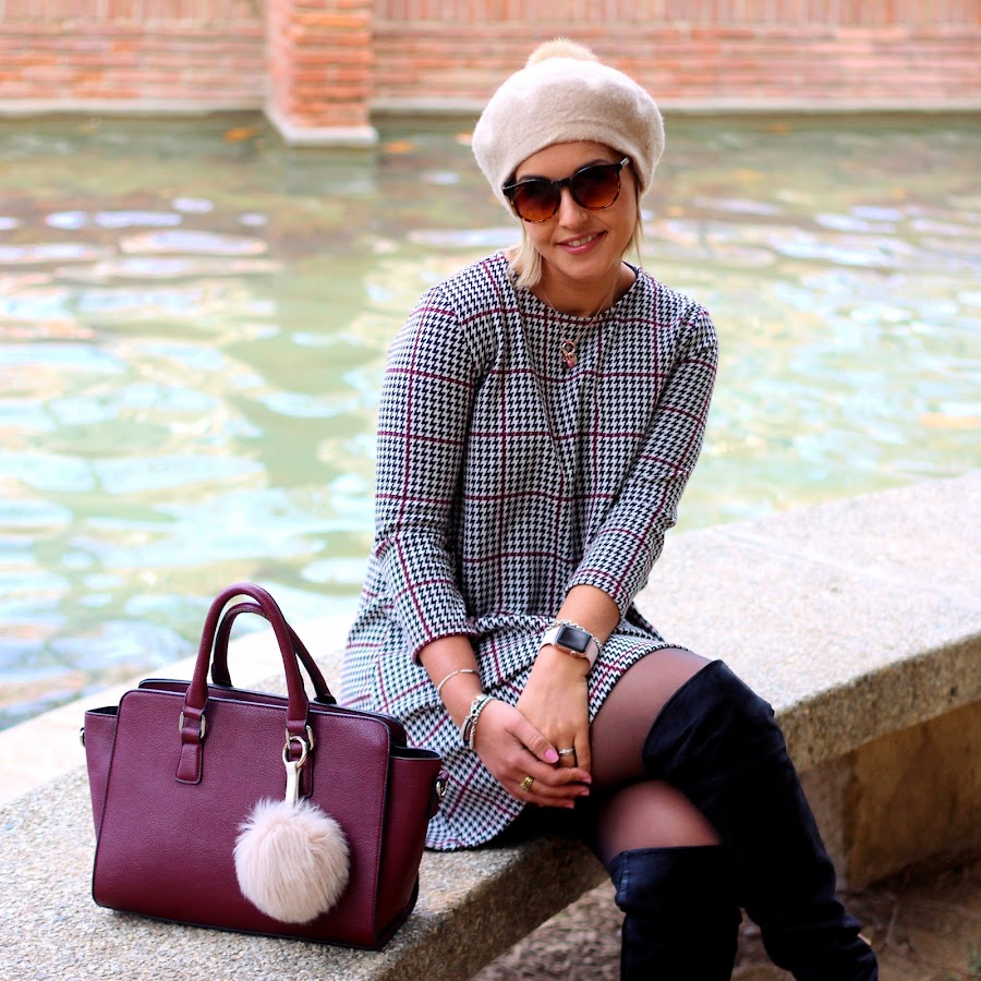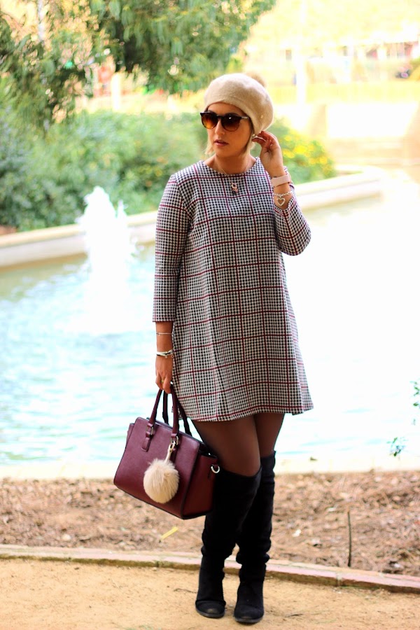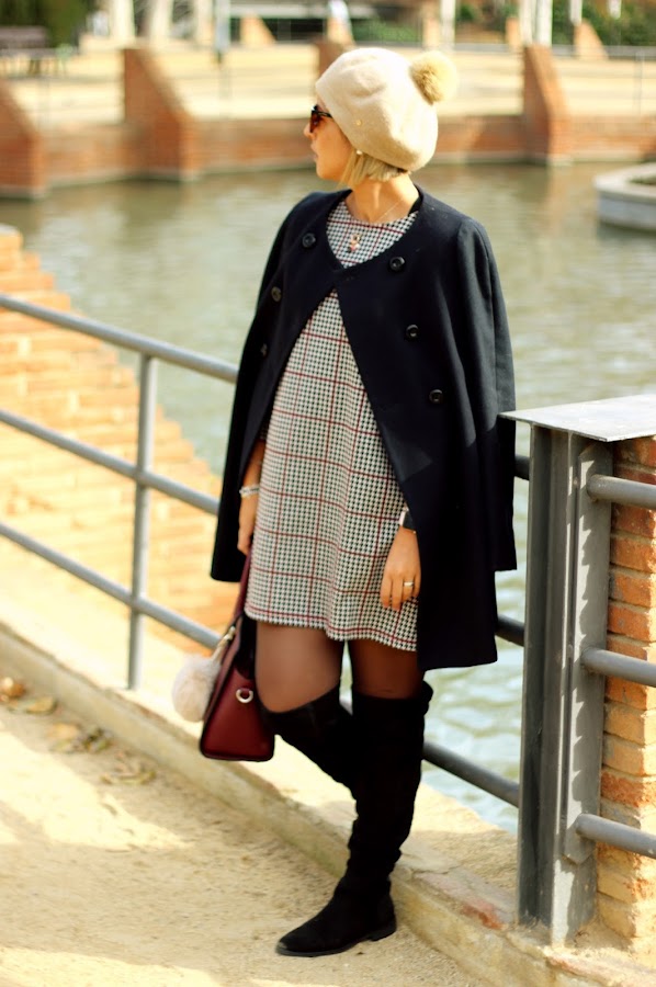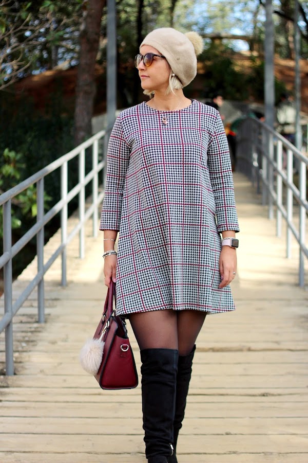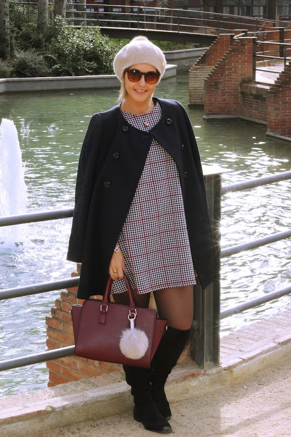 Sin duda una de las prendas que más me gustan son los vestidos. Tengo infinidad en mi armario y siempre hay sitio para uno más. Hoy os enseño un vestido de corte evasé con estampado de pata de gallo que me encantó por su versatilidad, ya que los puedes usar en looks informales con unos botines o en looks más arregladitos con una blazer y un buen tacón. En el look de hoy lo combiné con unas botas negras por encima de la rodilla, un abrigo estilo capa, un bolso granate y una boina beige con pompón.