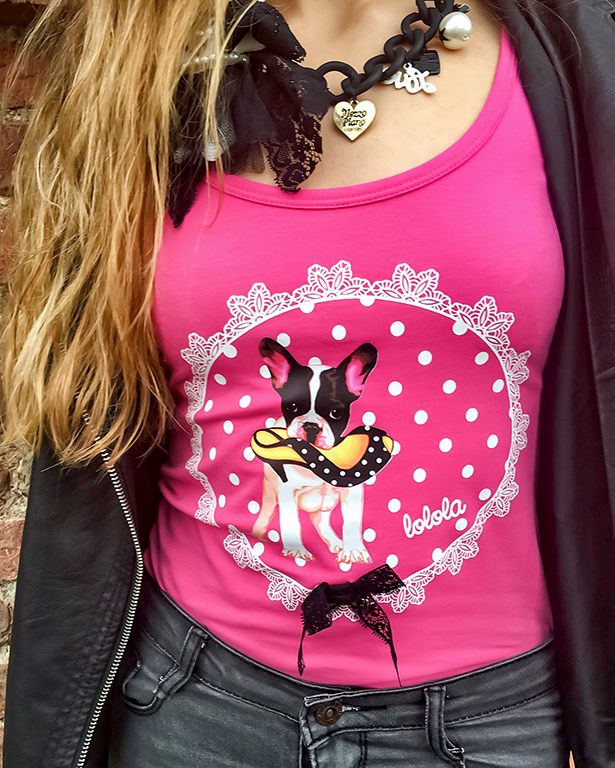 He de decir que la camiseta que os enseño hoy es una de mis favoritas, con un color rosa fucsia y un estampado de lo más original y un lazo de encaje negro decorándola. Es que me encanta!