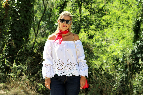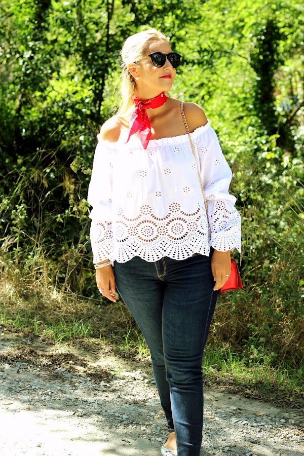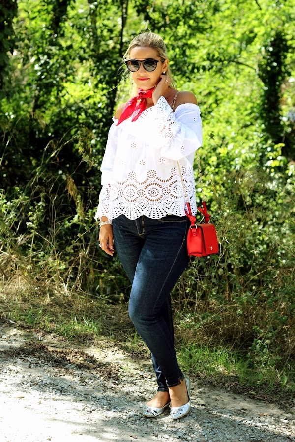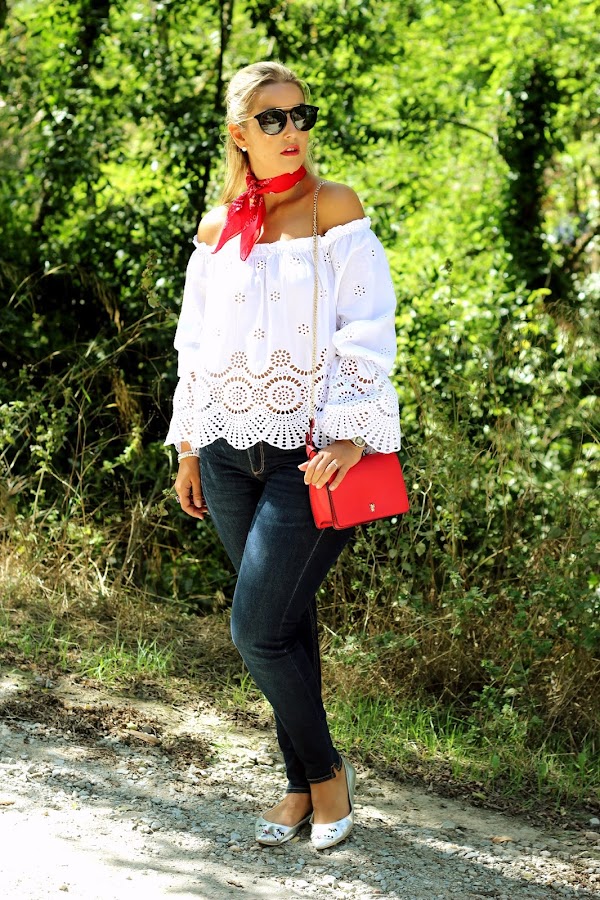 Hoy os traigo un look casual, muy sencillo pero con un toque chic. En el look de hoy os enseño mi blusa blanca con bordados y hombros descubiertos que compré en rebajas y me pareció super dulce. La combiné con unos jeans y para darle un toque de color, me puse una bandana roja. Los accesorios del look fueron mis manoletinas plateadas y mi bolso rojo.