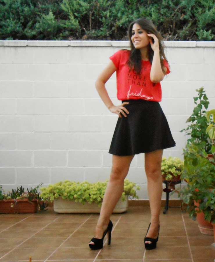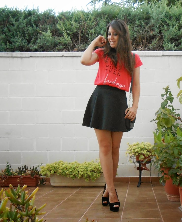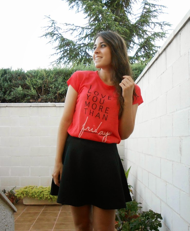 Todo esto viene por el mensaje de la camiseta que os enseño hoy. Me gustó tanto, que no pude evitar comprármela. Le he dejado todo el protagonismo, ya que he decidido terminar el look con complementos y falda de neopreno en negro. ¿Qué os parece?