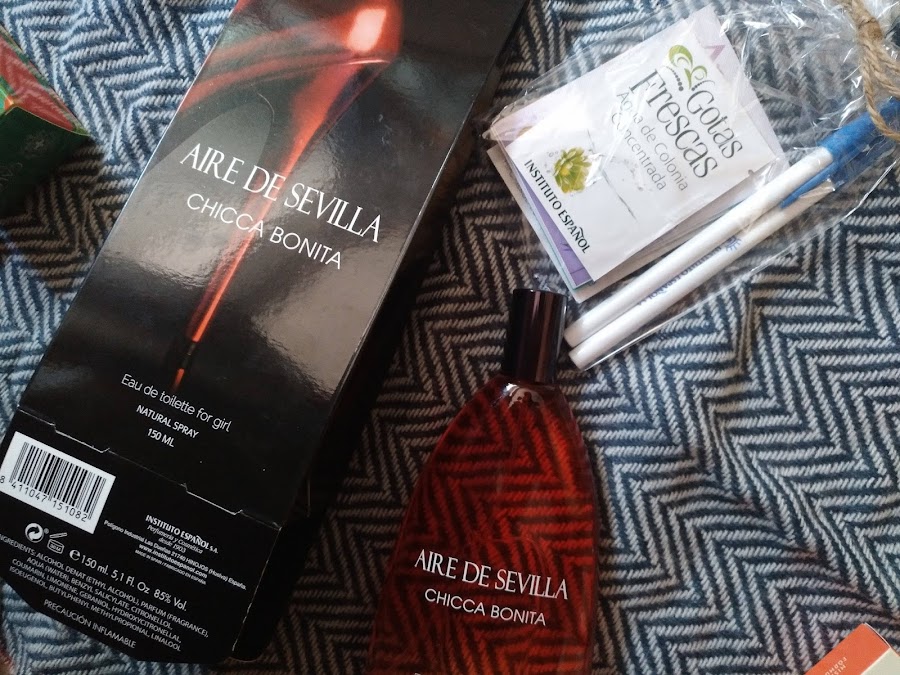 Instituto Español nos envió muestras de sus productos más conocidos (¿quién no ha tenido Gotas Frescas?) y además enviaron su perfume Chicca Bonita de Aire de Sevilla, que fue sorteado y me tocó a mí. ¡¡Huele genial!!