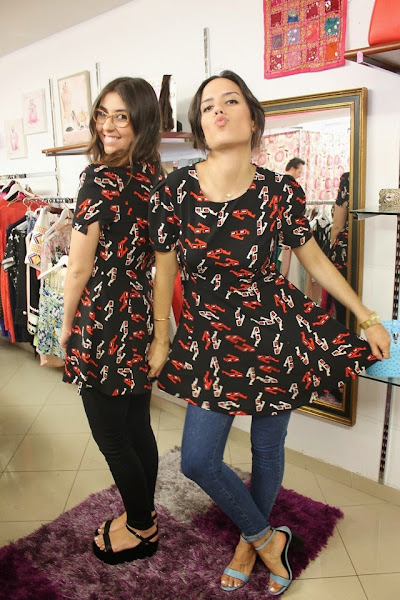 La señorita Meña y yo no pudimos resistir probarnos el mismo vestido de estampado gafas 3D.
