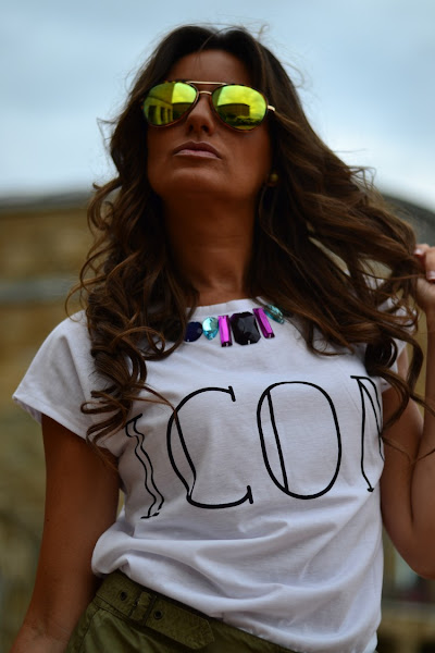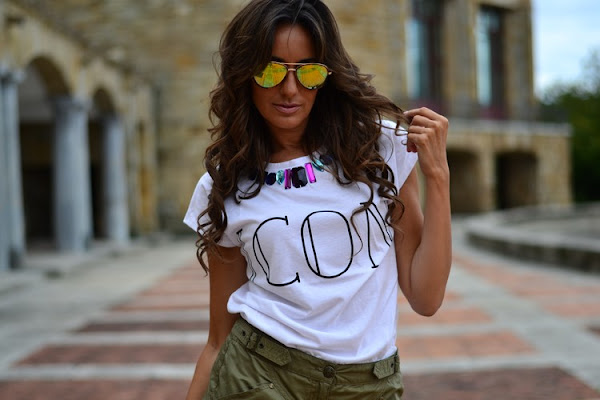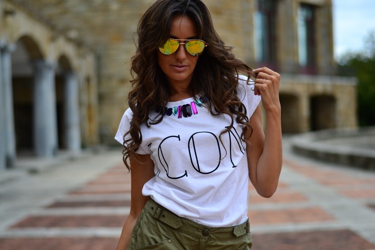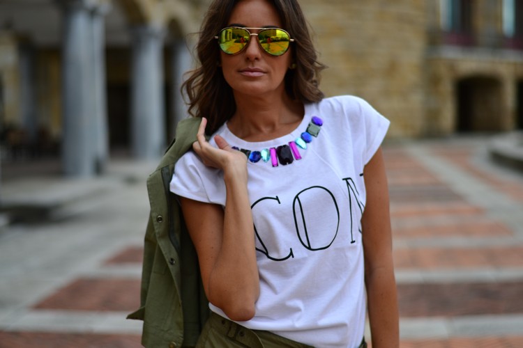 Para contrarrestar la monotonía cromática del verde militar de las otras dos piezas, nada mejor que una camiseta joya con efecto collar en el cuello de la misma. Concretamente, esta que llevo yo, es la típica blanca básica de algodón y manga corta, con cuello redondo decorado con pedrería.