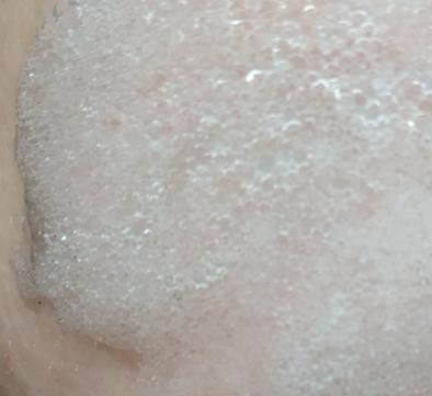 Cuando abres el envase y cogemos producto, tiene textura tipo gel, cuando te lo aplicas y pasa un rato, empieza una sensación extraña, como cosquillas y muy lentamente podemos ver como el gel, se va convirtiendo en espuma. Durante todo el tiempo, se siente la sensación de