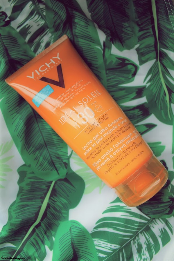Hoy os hablo de la crema que estoy utilizando actualmente en mis escapadas al sol y piscina. Se trata de la Ideal Soleil de Vichy Laboratoires, factor 30 debido a que soy muy blanquita de piel y para las primeras exposiciones siempre prefiero un factor alto para luego ir bajando al 20, no más. Además protege de los rayos UVB (responsable del bronceado pero también de las temidas quemaduras, reacciones alérgicas y cánceres de piel) y rayos UVA (los rayos que penetran en las capas más internas de la piel provocando las arrugas y las alergias).