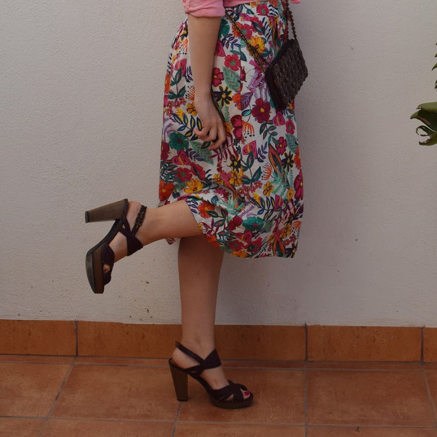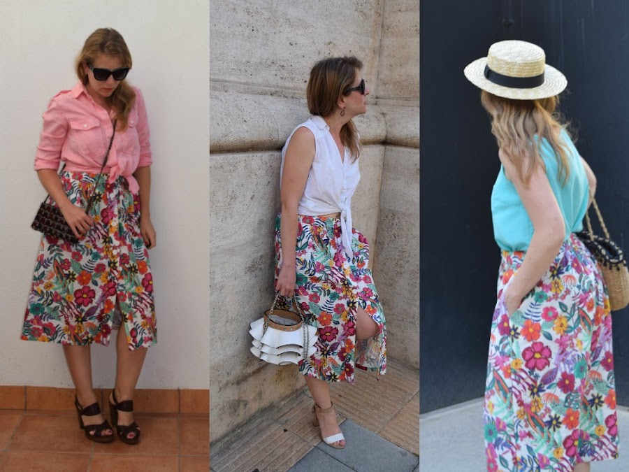 Hoy traigo tres propuestas nuevas con una falda midi de flores, que va a seguir siendo tendencia en otoño. Quizá no con este colorido, pero las ideas de hoy seguro que te sirven para una falda floreada cualquiera.