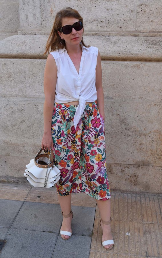 La base es sencilla. Como la falda ya es vistosa de por sí, lo mejor es jugar con tonos neutros en la parte de arriba y con los complementos. El blanco no va a fallar nunca, de hecho es mi primera opción. Pero también puedes atreverte con colores más llamativos dentro de la gama de los tonos de la falda.