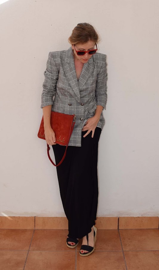 Una chaqueta cruzada, en este caso de cuadros, pero que con un vestido negro puede cambiar a colores más veraniegos.