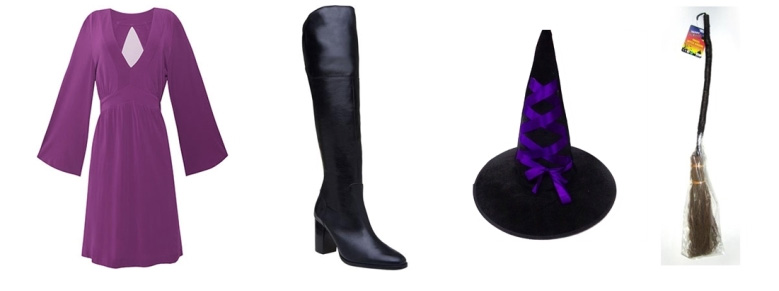 Bruja: Basta con un vestido violeta o dentro de sos tonos y unas botas. Como accesorio consiga un sombrero y una escoba!