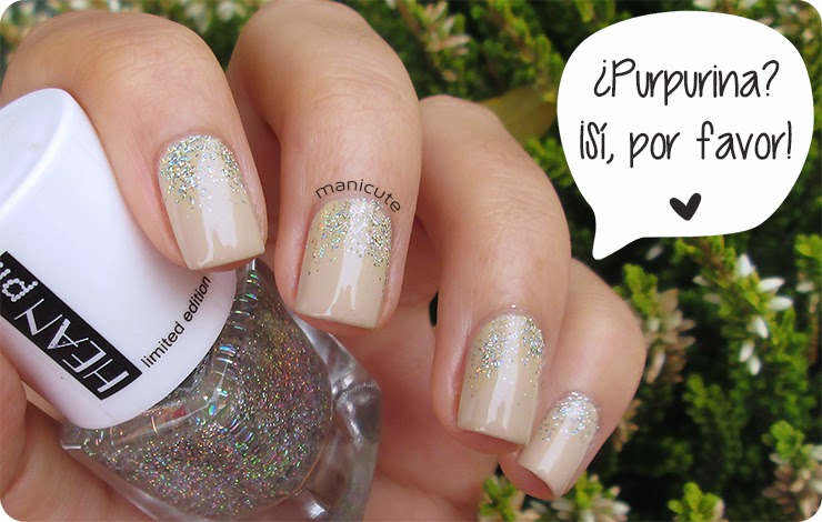 Con respecto a la purpurina, os recomiendo que utilicéis una esponja de maquillaje para aplicarla. De este modo, vais a lograr más precisión para que se quede en la base de la uña y, sobre todo, lograréis que la esponja absorba todo ese liquidito transparente que no sirve para nada (bueno, sirve para hacer que nos desesperemos hasta que se seque la manicura...)