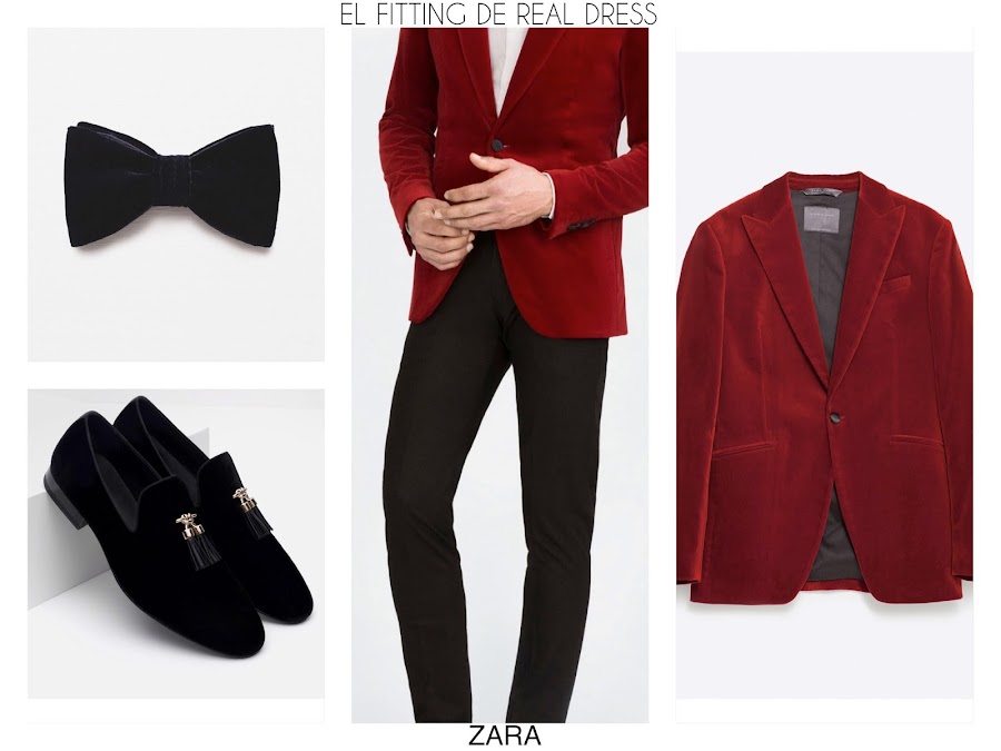 En cuanto a la vestimenta podemos decantarnos por un pantalón de vestir con un corte un poco más actual (tirando a pegado y no muy largo) acompañado de camisa blanca o negra entallada y como complemento ideal una pajarita, éstas muy de moda en terciopelo y mullidita. La chaqueta puede ser una a juego del pantalón o una también de terciopelo. En este caso presento dos look diferentes, seguidos de una secuencia de outfits con trajes o americanas de terciopelo combinadas con pantalones de vestir.