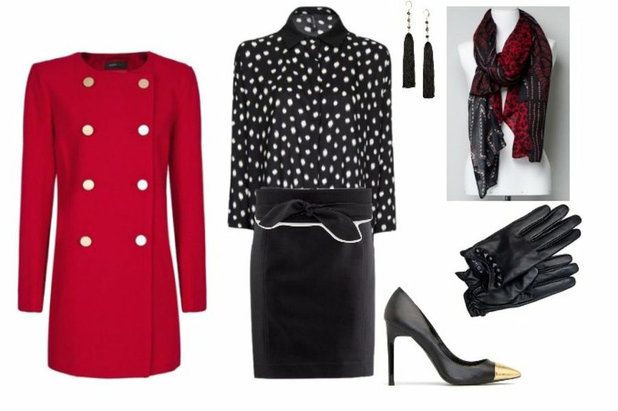 La última opción de nuestra experta es decantarnos por un outfit elegante y distinguido acorde con una imagen muy femenina. Las prendas necesarias para conseguirlo serán un abrigo de paño rojo o granate, blusa de lunares y falda de tubo negra a la que podremos añadir una lazada a la cintura. Respecto a los complementos, la asesora nos recomienda un pañuelo de gasa estampado, zapatos bicolor o estampados, pendientes largos y guantes de piel.