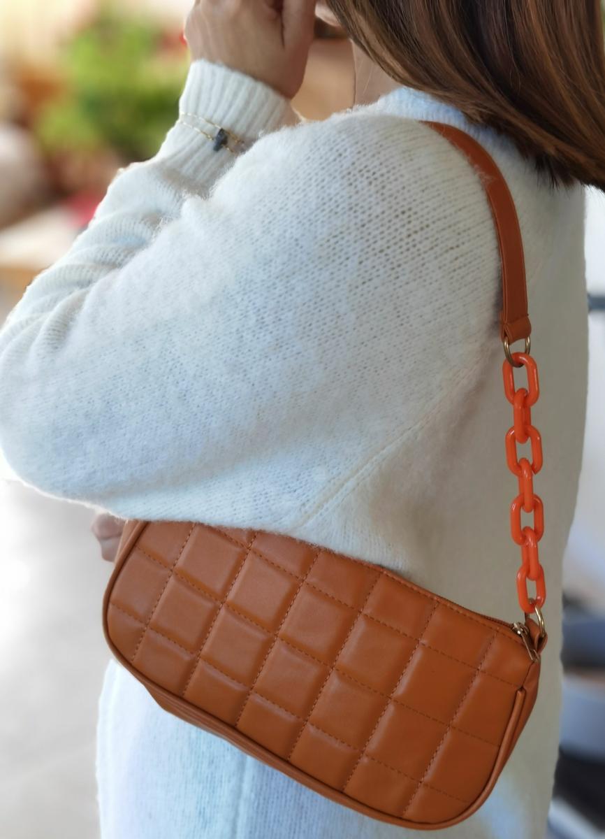 Este bolso, tiene 4 tendencias en uno: 1. El modelo Baguette que creó la casa Fendi, 2. Una parte con cadena, 3. El acolchado del famoso Padded Cassette de Bottega Veneta (el bolso más clonado de este año) y 3. Colores vitamina que vieneron desde la primavera.