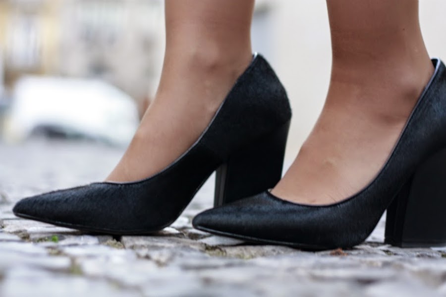 Los zapatos son de lo más cómodo que tengo. Quería unos stilettos negros lisos sin ningún adorno pero no encontré ningunos que me gustasen así que opté por estos zapatos de punta con tacón maxi ancho, que a parte de bonitos me permiten horas y horas de camino con ellos.