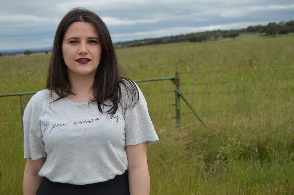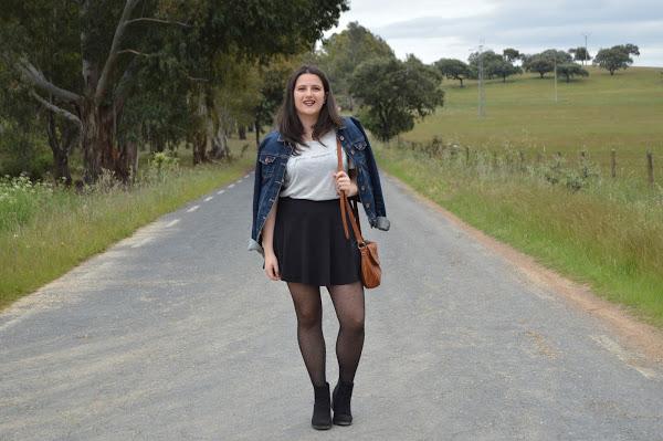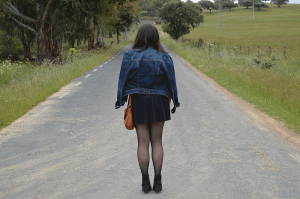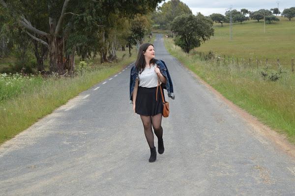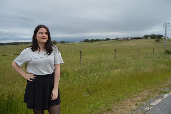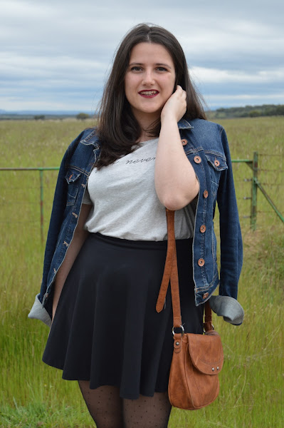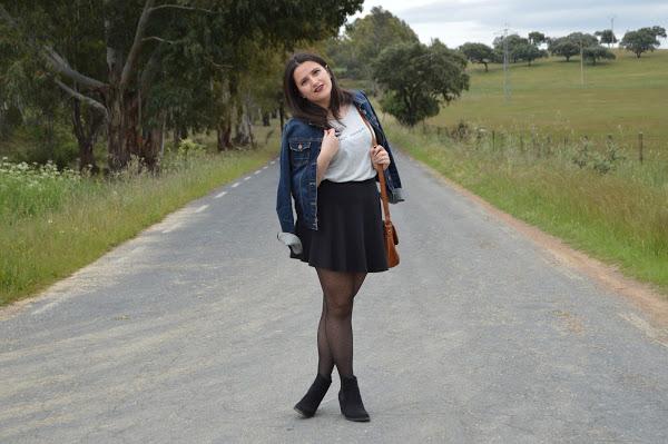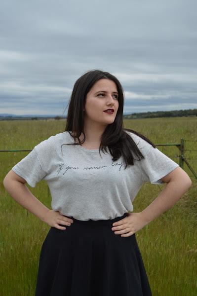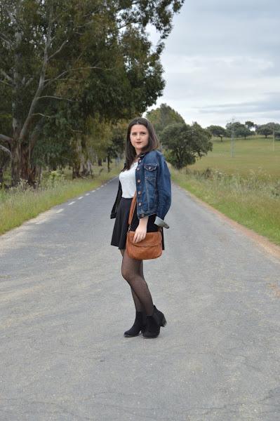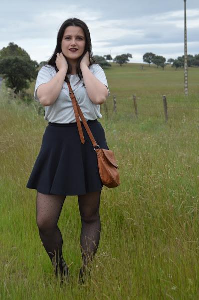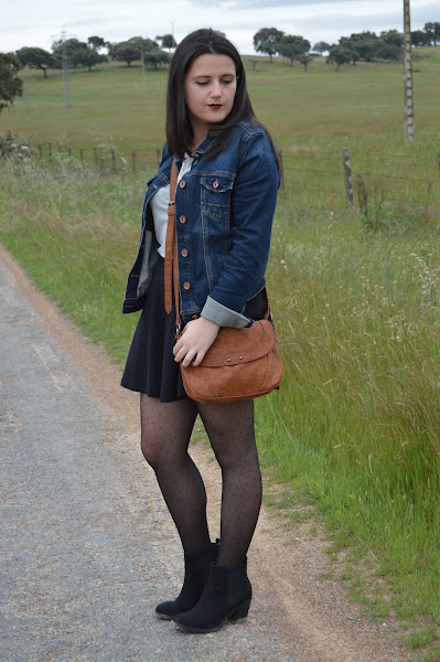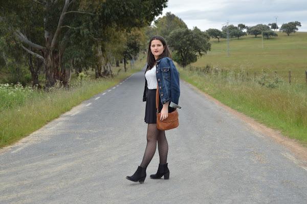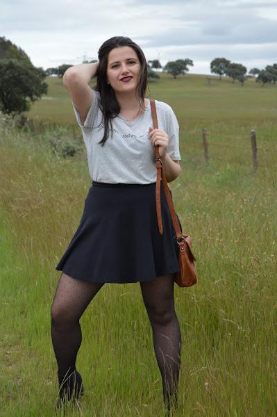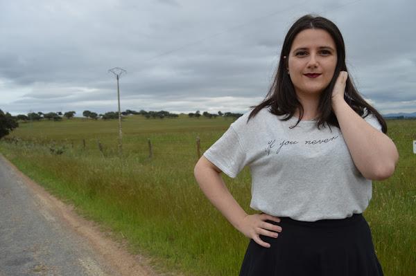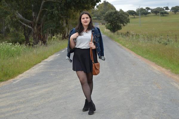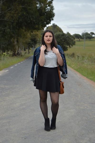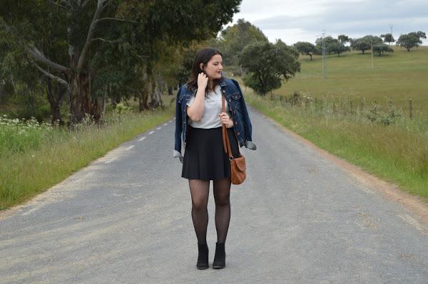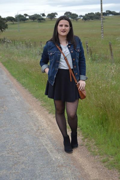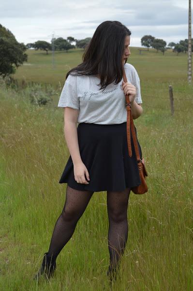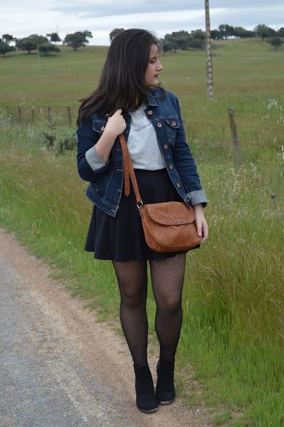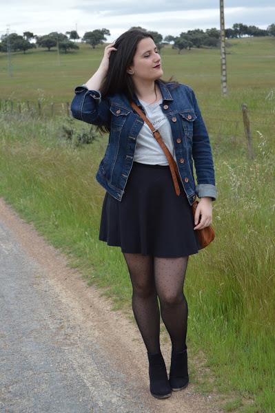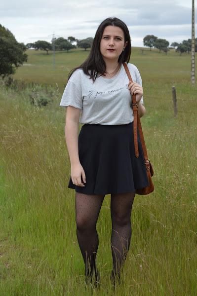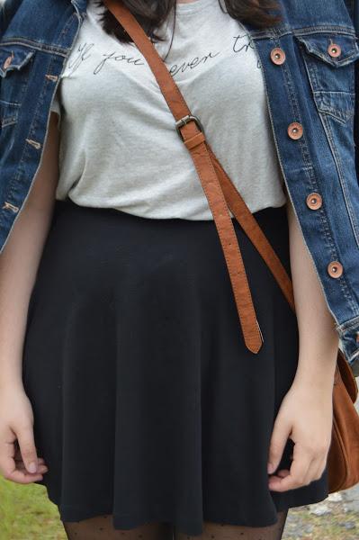Bueno os cuento un poco de él, camiseta básica pero con un mensaje con el que me siento muy identificada: ""if you never try... you"ll never know."" Falda skater que habéis visto mucho por el blog. Por supuesto, medias plumeti y botines chelsea, ya sabéis que esa combinación es estrella. Le he añadido una cazadora vaquera para darle un toque más desenfadado y un bolso marrón, ¿quién dijo que el marrón y el negro no combinaba?