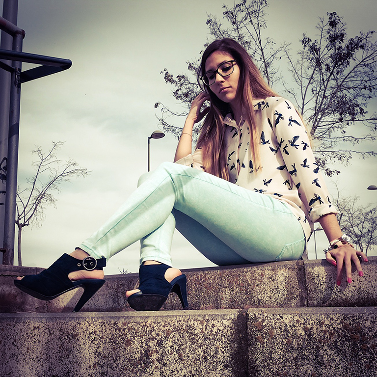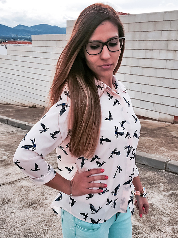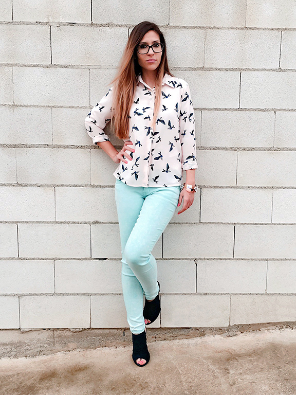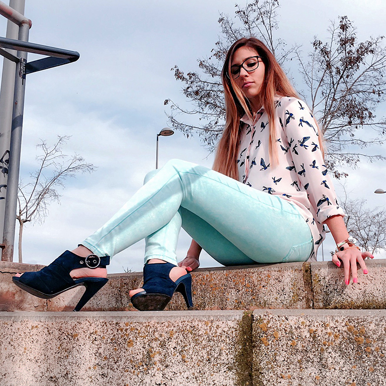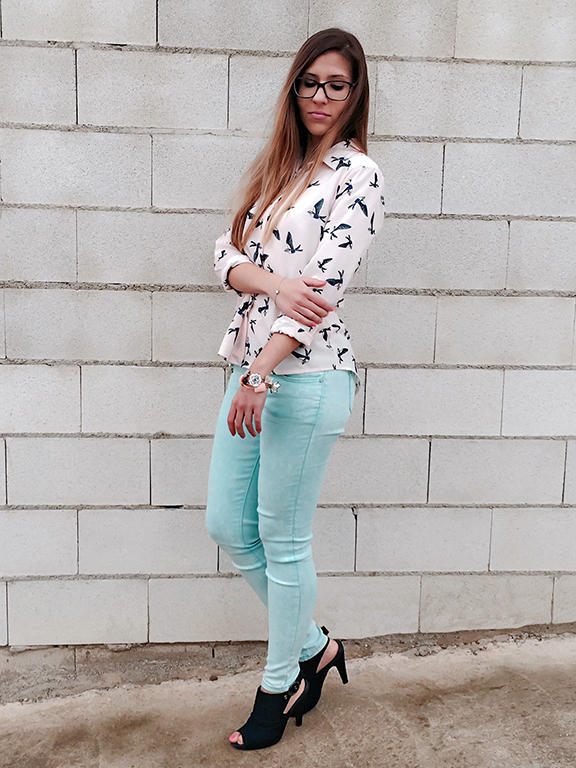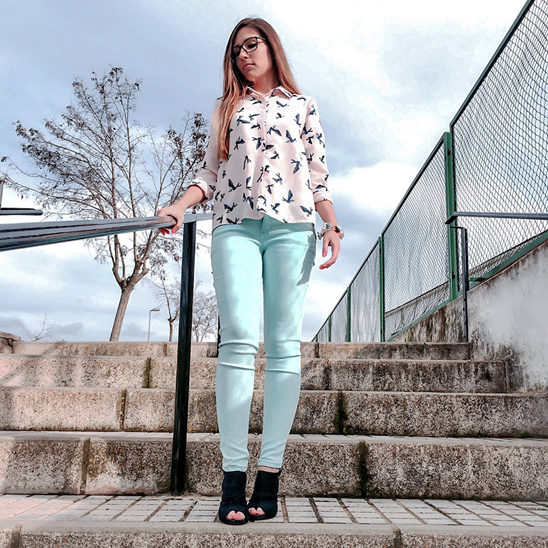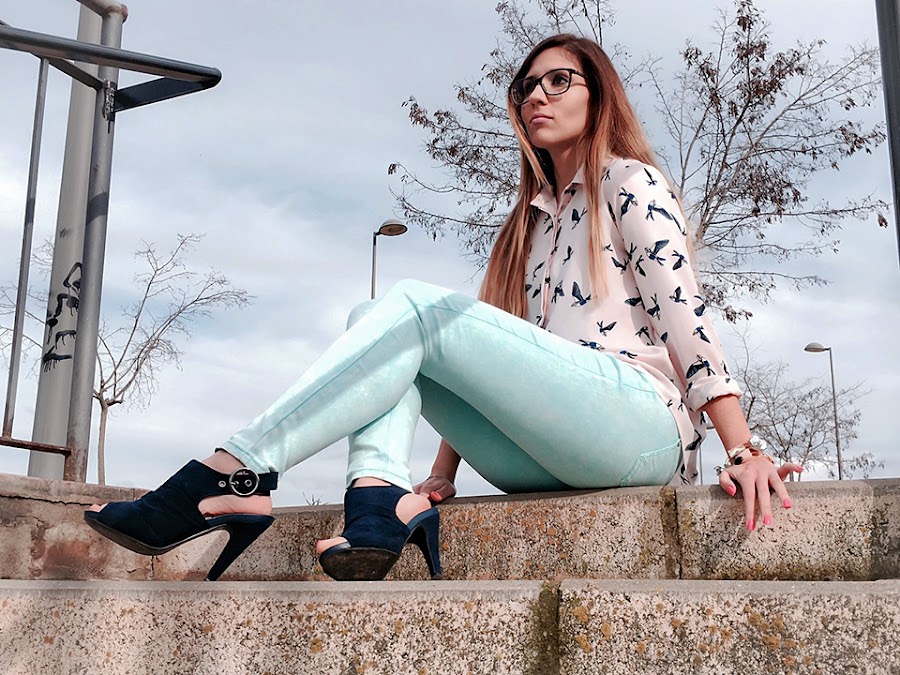 La he combinado con unos vaqueros elásticos súper cómodos que se adaptan perfectamente al cuerpo, en un tono verde agua y con mis sandalias abotinadas azul marino, a juego con el estampado de pájaros de mi blusa.