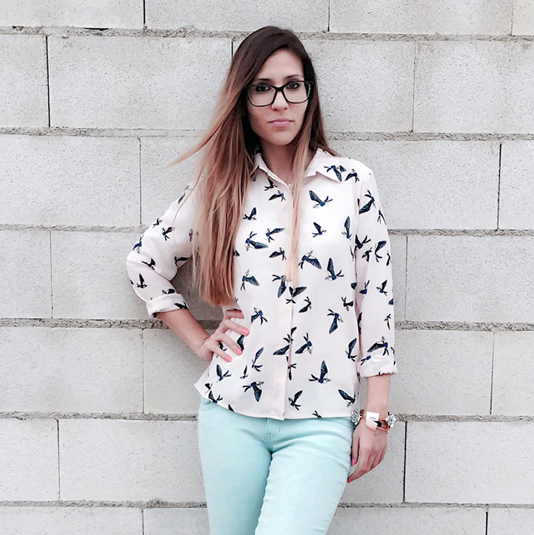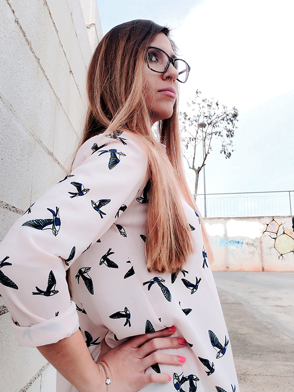 Este año se llevan las blusas estampadas! No hace mucho os enseñé una de mis blusas con pintalabios impresos y hoy os enseño una blusa en un tono rosa pastel, que combina genial con el azul marino de los pájaros que la decoran.