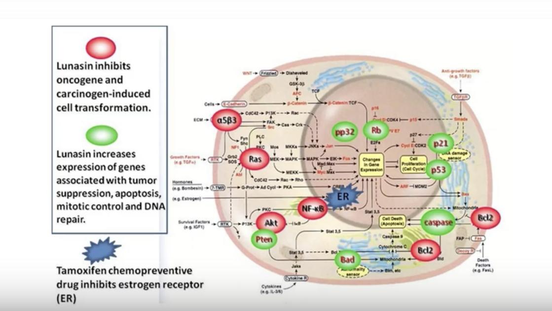 El mecanismo multidireccional de la actividad anticancerígena e inmunomoduladora de la lunasina se debe principalmente al hecho de que a través de su especificidad es capaz de ingresar activamente a la célula, al núcleo, unirse al material genético y destruir la célula cancerosa.