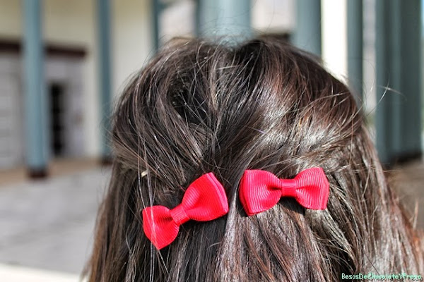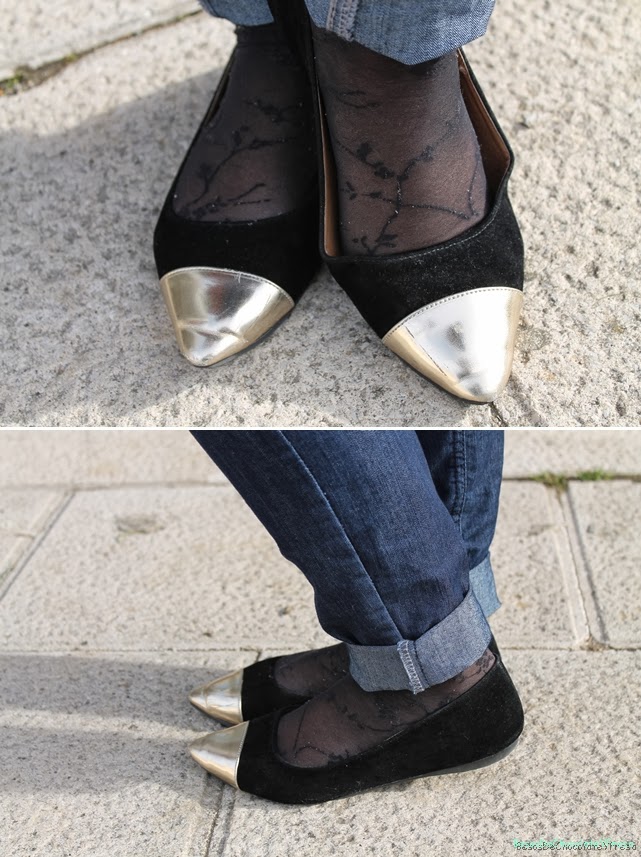 La combiné con jeans oscuros y tonos negros en las bailarinas y medias con flores, sweater en negro de cuello vuelto. Como complementos foulard en negro, clutch del mismo color y pinzas de lazo en color rojo.