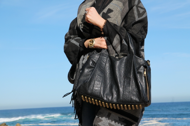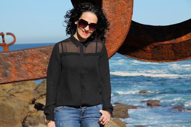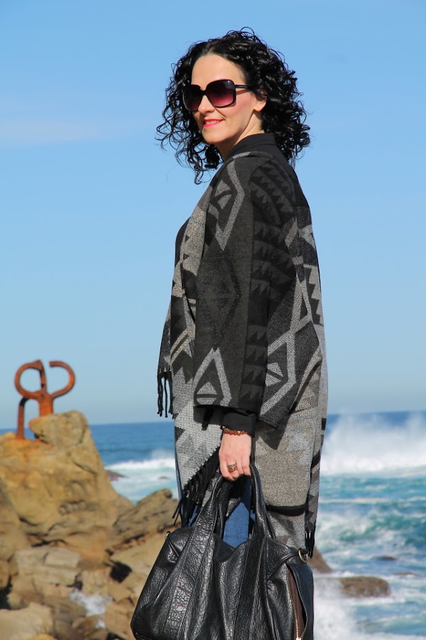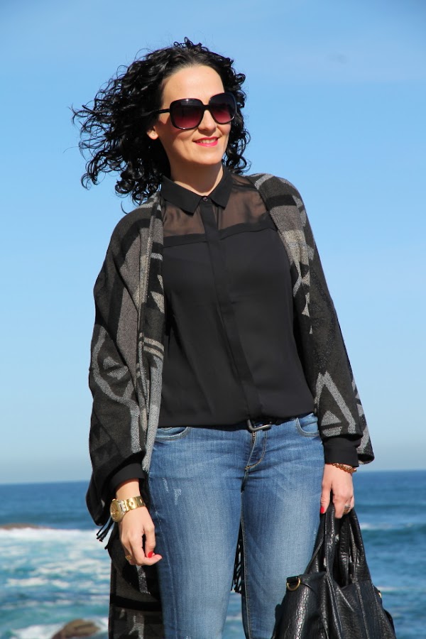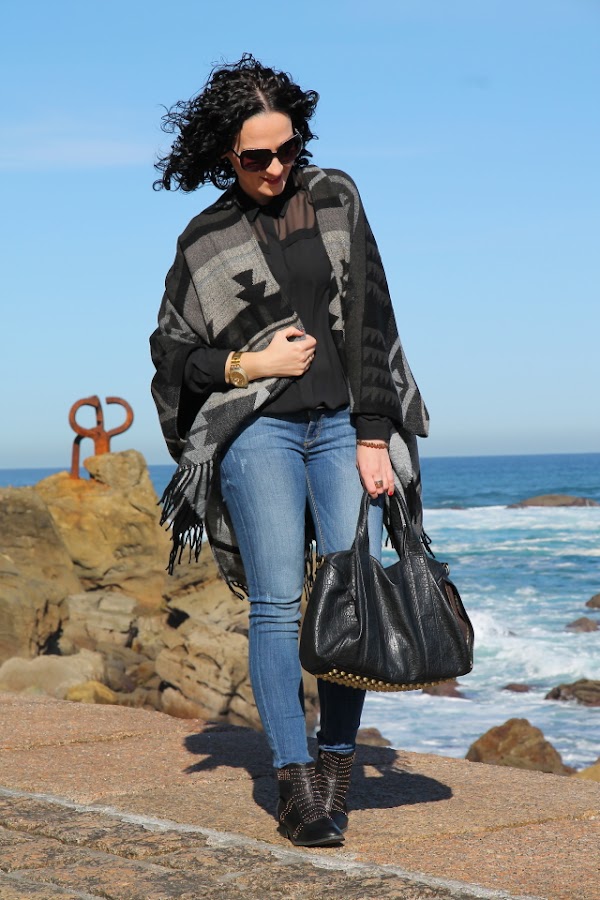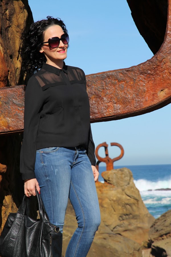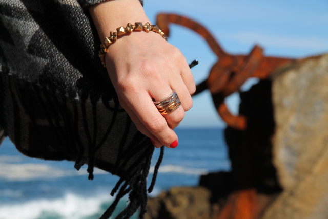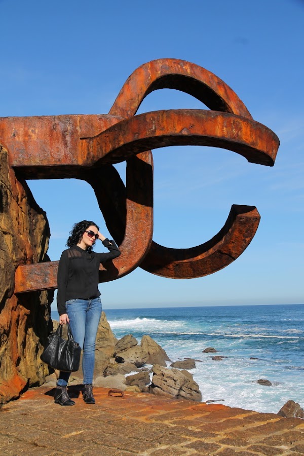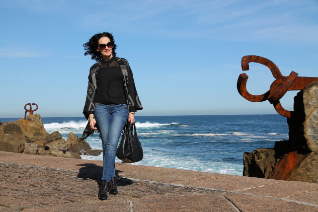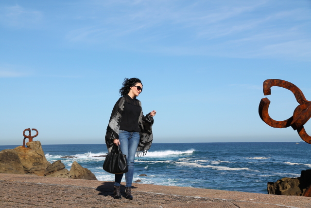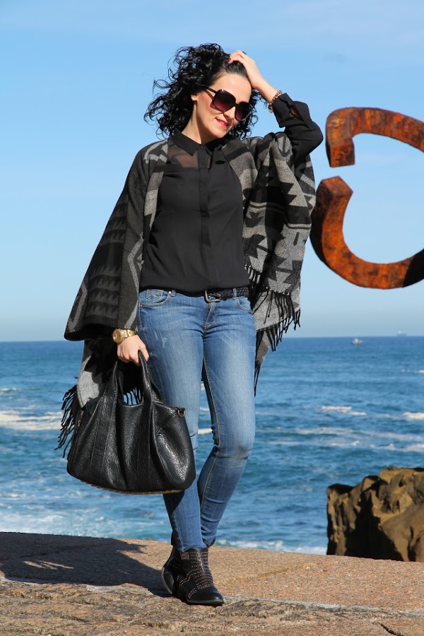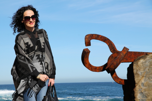Las fotos de hoy las hicimos durante nuestro viaje por el Norte. Me gustan especialmente porque están hechas en uno de los lugares que más me gustan de San Sebastian, el Peine del Viento de Chillida, un sitio con una magia especial que me conquista. Para hacer turismo por la zona opte nuevamente por un look cómodo con una camisa vaporosa, tejanos pitillo y mi nuevo poncho. Fue una gran idea el llevármelo a este viaje porque me resultó perfecto para la primeras y últimas horas del día que era cuando refrescaba. Como veis, el sombrero me lo tuve que quitar porque con la brisa del mar corría el riesgo de salir volando y con lo que me gusta preferí no arriesgar.