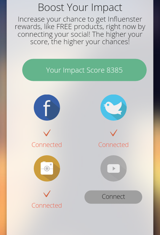 Enlaza todas tus redes sociales (Facebook, Twitter, Instagram,Youtube, Blogger, Tumblr, Foursquare) de esta forma "INFLUENSTER" empezara a sumar y a calcular tu impacto social (Amigos+Seguidores)