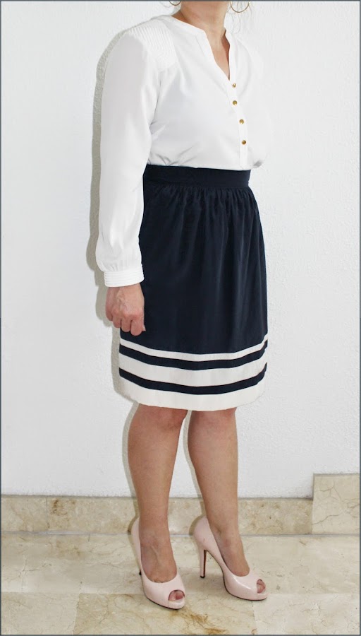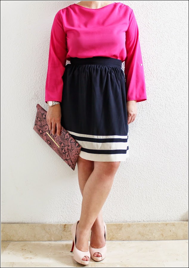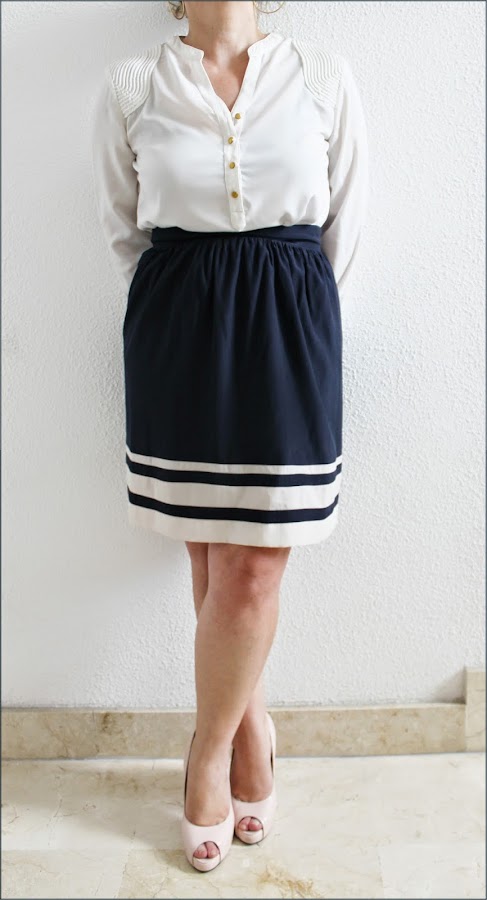 Un look con falda navy, es un clásico que podemos ver cada verano, y la verdad es que no nos cansamos, resulta femenino, sencillo y muy elegante.