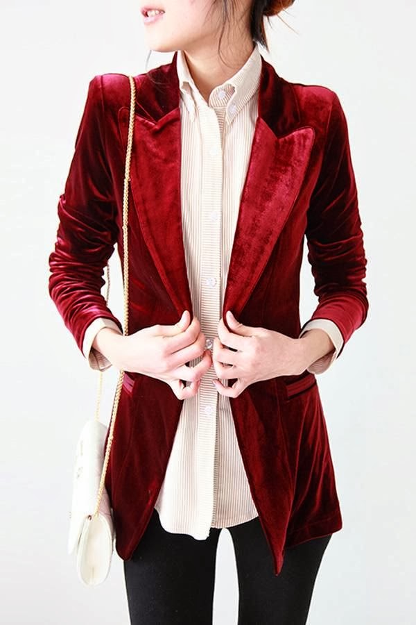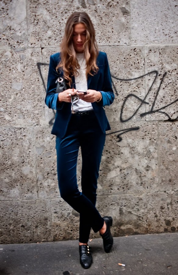 Adoro el terciopelo en americanas, trajes de chaqueta, abrigos, complementos para el pelo, shorts, faldas, vestidos y pantalones. Mejor darle el protagonismo y rebajar la importancia de el resto de prendas que le acompañan. Si no, resulta demasiado recargado.