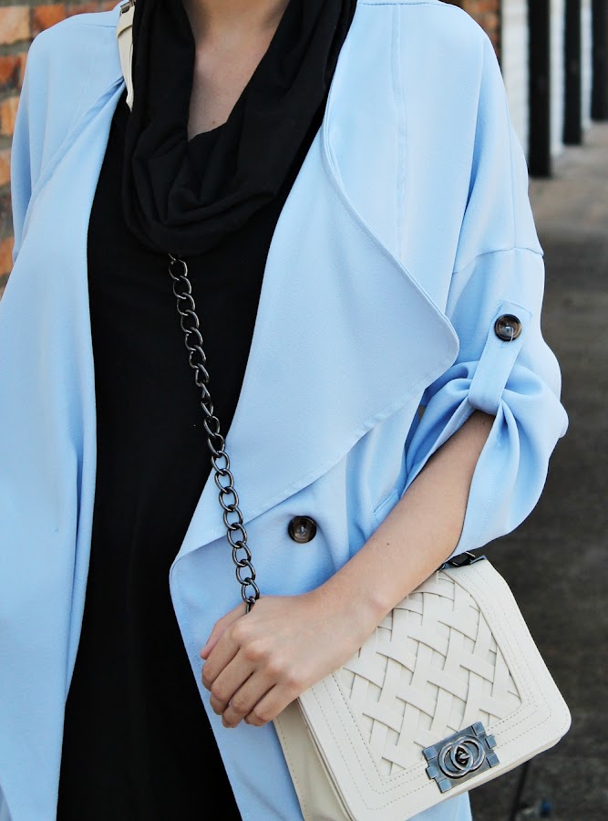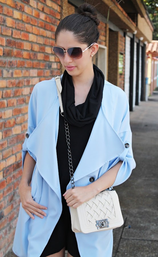 Decidí utilizar este vestido corto negro que es de cuello tortuga (otra de las tendencias que hemos visto en todas partes), el abrigo azul bebe que particularmente me encanta por la estructura que aporta, tacones color nude que son básicos en Kendall para hacer lucir sus piernas mucho más largas de lo que ya son jajaja, una cartera estilo chanel y como accesorios zarcillos de perla y los mega lentes.