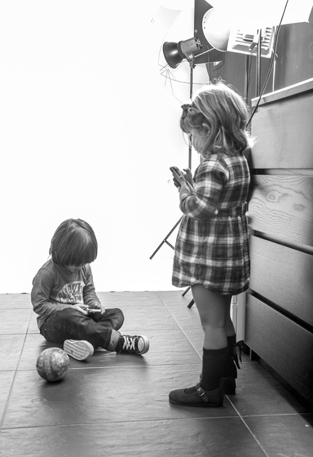 Romeo, aunque pendiente de Iria y Nora, juega con el teléfono móvil de su madre.
