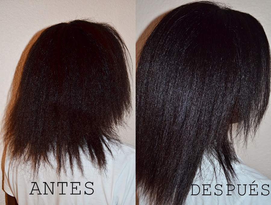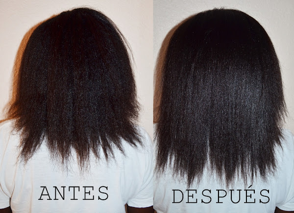 En nuestro caso al tener pelo de negras nuestro pelo es diferente al de otros pelos,más fuerte y seco, pues bien..simplemente se lavó el pelo (en la foto del antes) y se lo dejó secar al aire libre. Sin echarle cremas ni nada cuando le alisé el pelo ( a 200º) lo dejó con brillo y con una suavidad increíble. Os juro que no paraba de decir, qué fuerte.