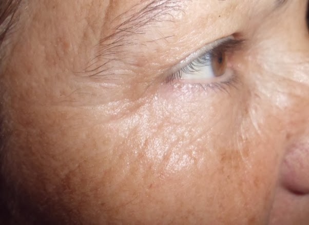 Al cabo de dos semanas de uso la piel queda muy bien, se ven mucho menos las arrugas. Esta foto está tomada bien de cerca. Se ve el párpado movil se ve más hidratado.
