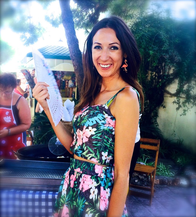 Considero que los complementos pueden transformar totalmente un look y que es una manera segura de otorgarle tu toque personal al atuendo. Como veréis a continuación, no en todas las fotos llevo los mismos accesorios, en algunas de ellas uso pendientes largos de flamencos sin collar ni flor en el cabello y en otras utilizo pendientes cortos, flor hawaiiana en el pelo y collar surfero de perla cultivada. Personalmente prefiero no usar collar si me pongo pendientes largos.