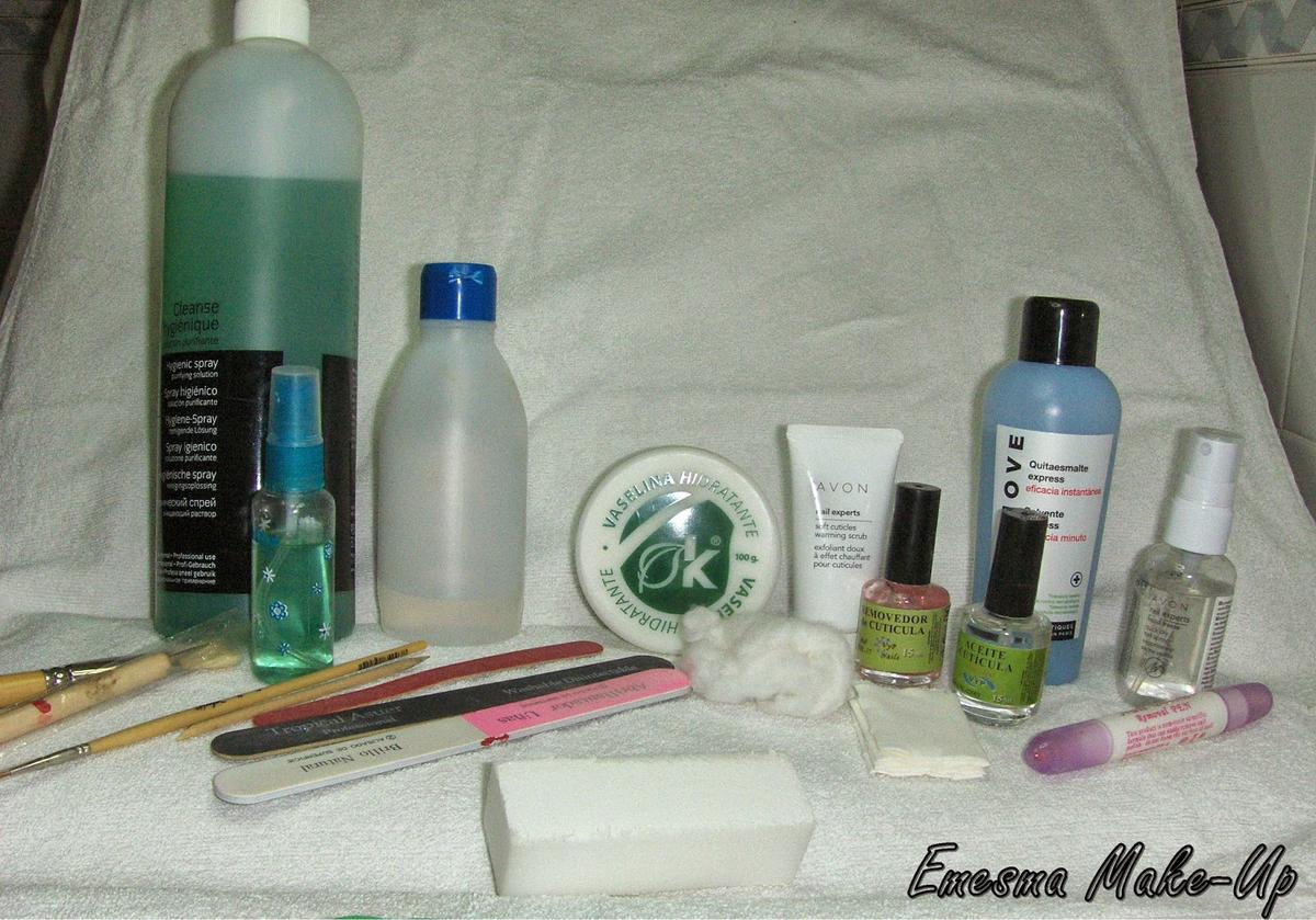 Estos son los productos que suelo usar para mis manicuras, hay algunos de profesional y otros de andar por casa. Si os intriga saber qué es el bote grande verde, es de Peggy Sage y es el spray higiénico 3 en 1.
