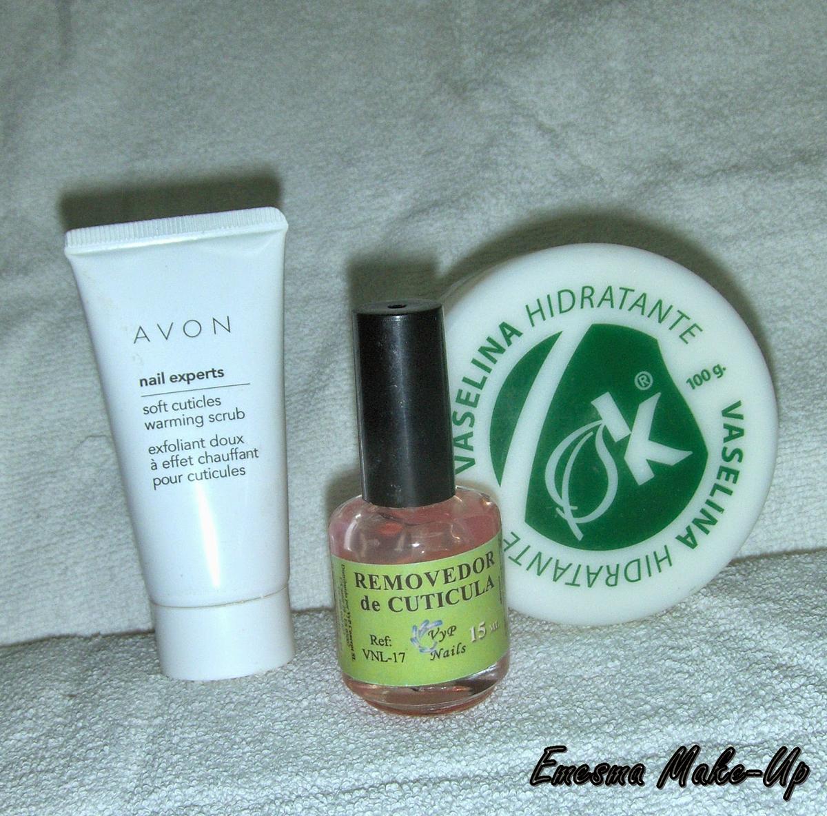 -Usa un poco de vaselina, exfoliante de cutículas (el mío es de Avon) o removedor de cutículas (este es de VyP Nails) en cada dedo. Empuja las cutículas con un palito de naranjo o si las tienes muy largas, cortalas con una tijera pequeña. Los que veis en la foto son los que yo suelo usar.