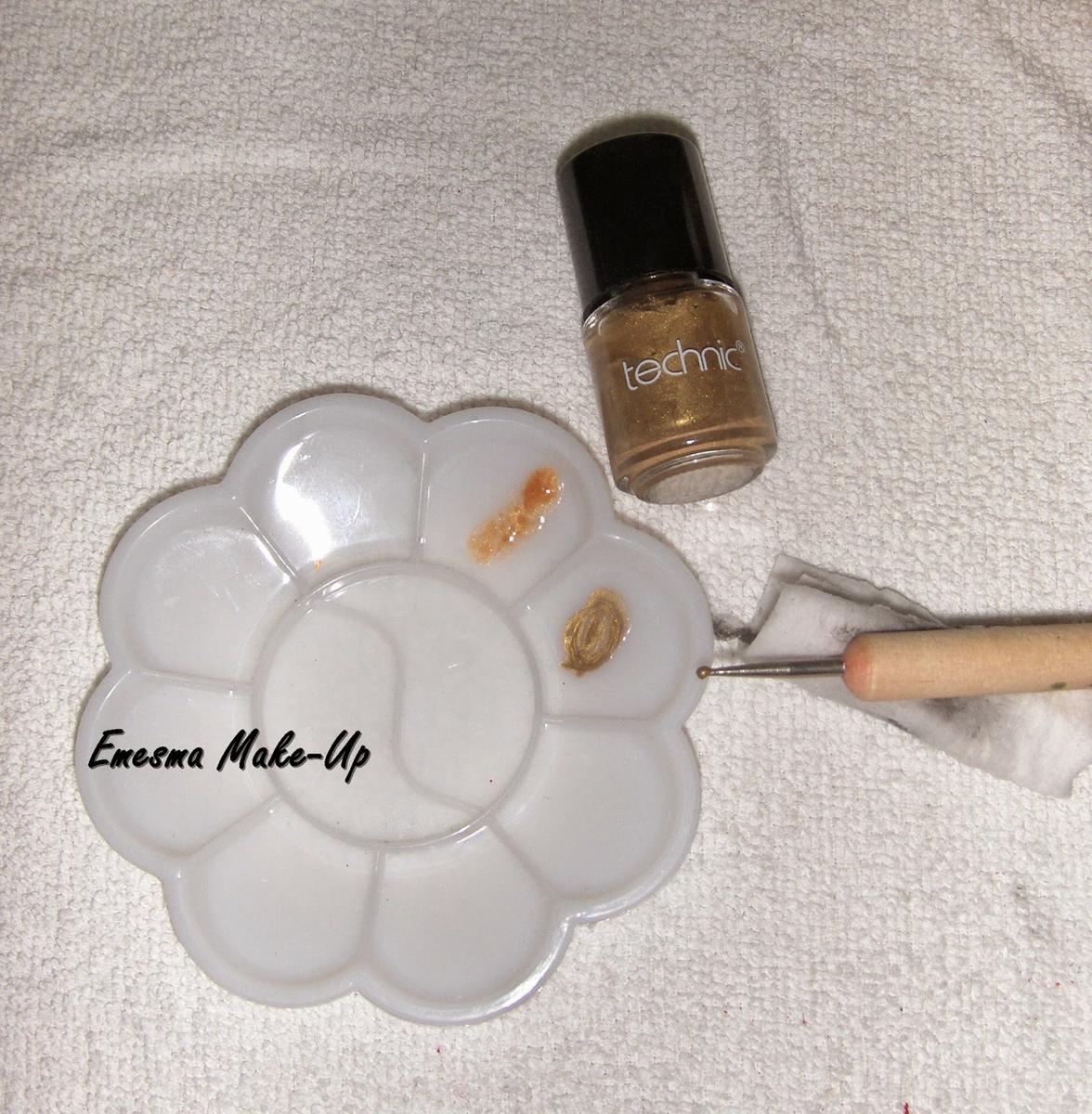 Ahora vamos a por el último paso. Coge un punzón para hacer puntitos y esmalte dorado (Technic, de venta en Carrefour) y haz unos puntos en cada unión de las líneas del esmalte negro. Le dará un toque divertido y recuerda a los botones metálicos de las faldas de cuadros.
