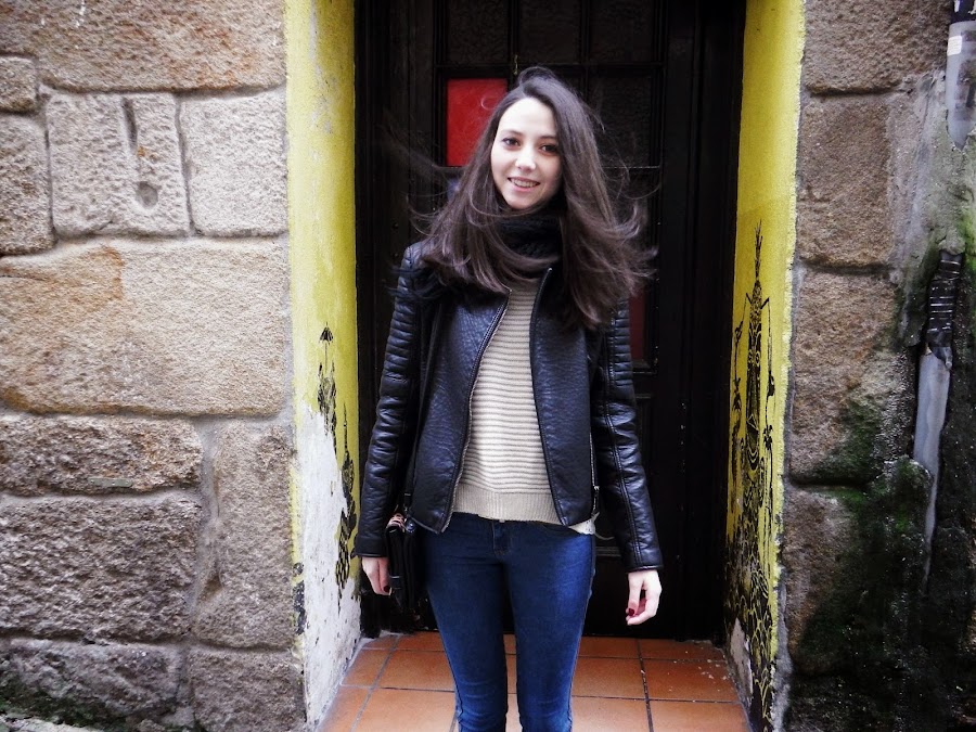 Cazadora: Mango / Jersey y vaqueros: Bershka / Bolso: Stradivarius / Bufanda: HyM / Funda iPhone: Zara